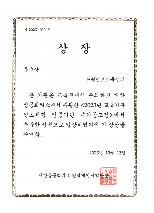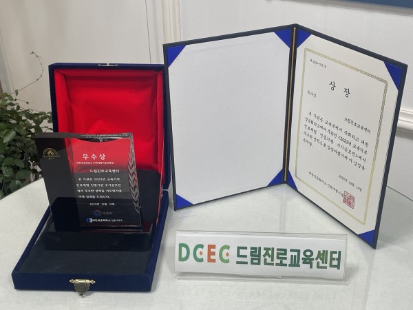 저희 센터가 2023 교육기부 진로체험 인증기관 수기 공모전에서 우수상을 수상하였습니다.